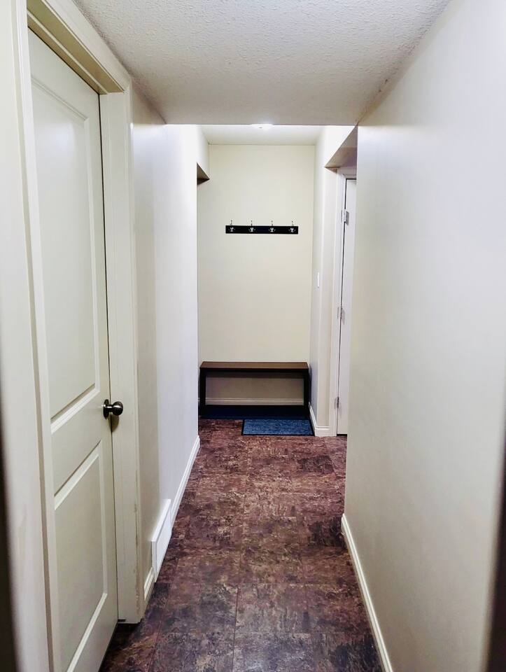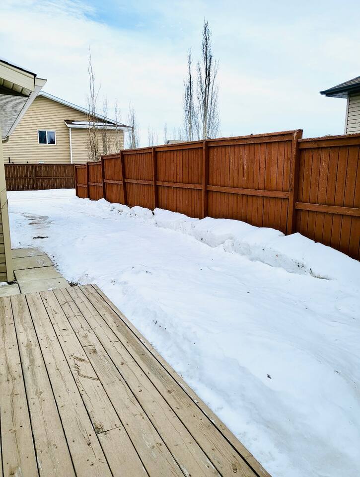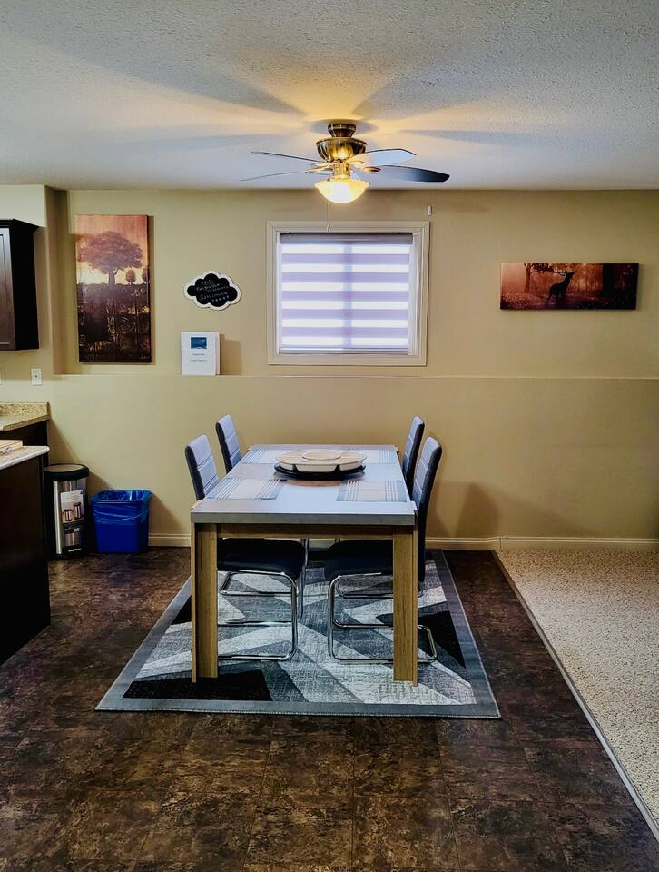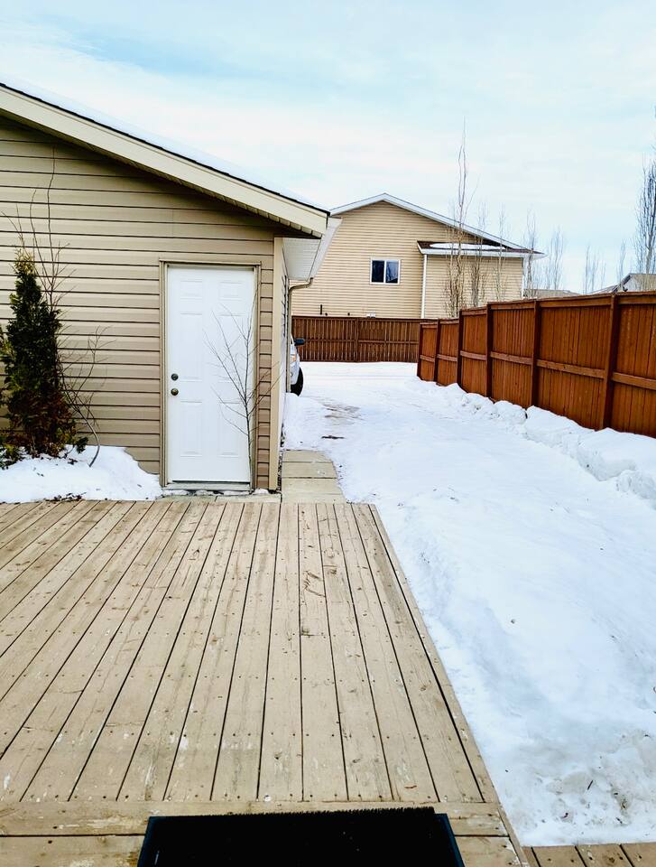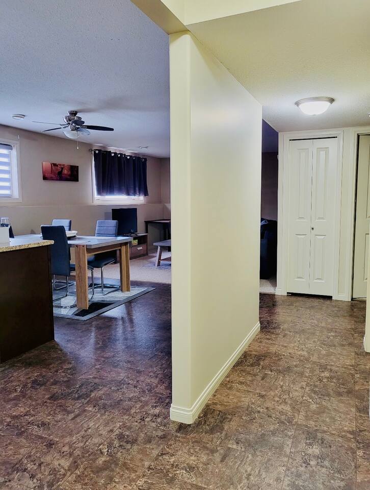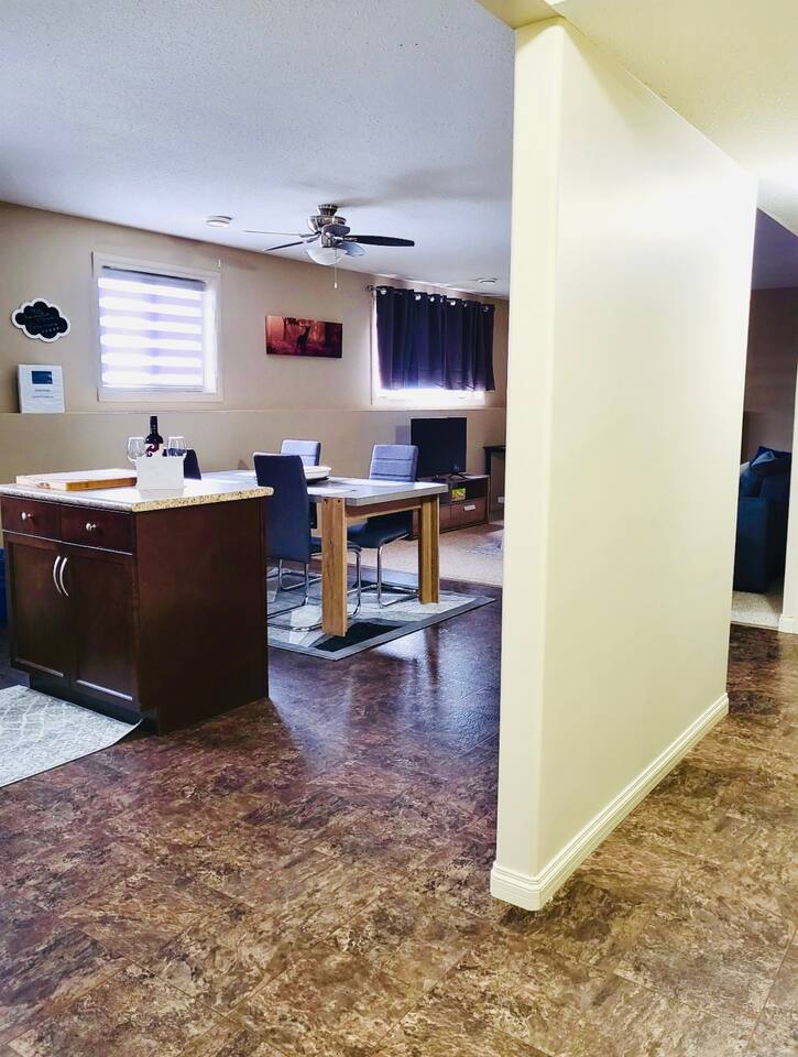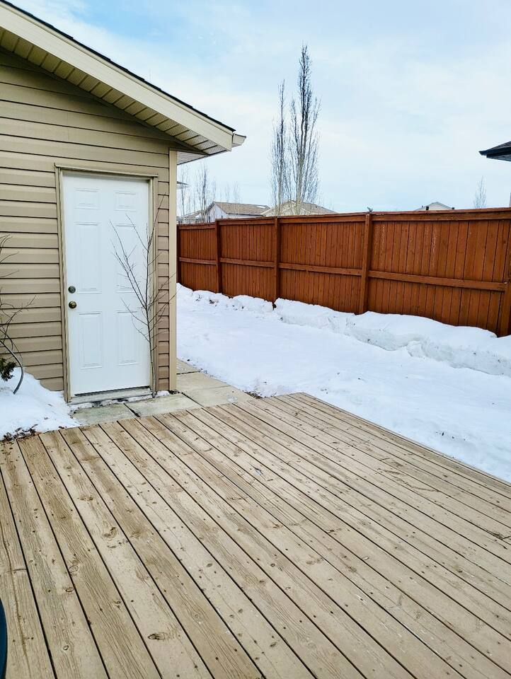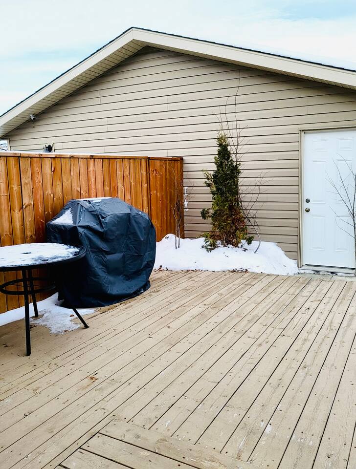 Spacious basement suite in Victoria Park, Camrose, featuring two queen beds and a pullout couch for flexible sleeping arrangements. Enjoy plenty of natural light during the day, a fully stocked kitchen, and a full bathroom. Stay entertained with board games or relax with Disney+. The large deck comes with a BBQ and outdoor seating, perfect for outdoor enjoyment. The suite stays cool in the summer, and free laundry machines are available for your convenience.