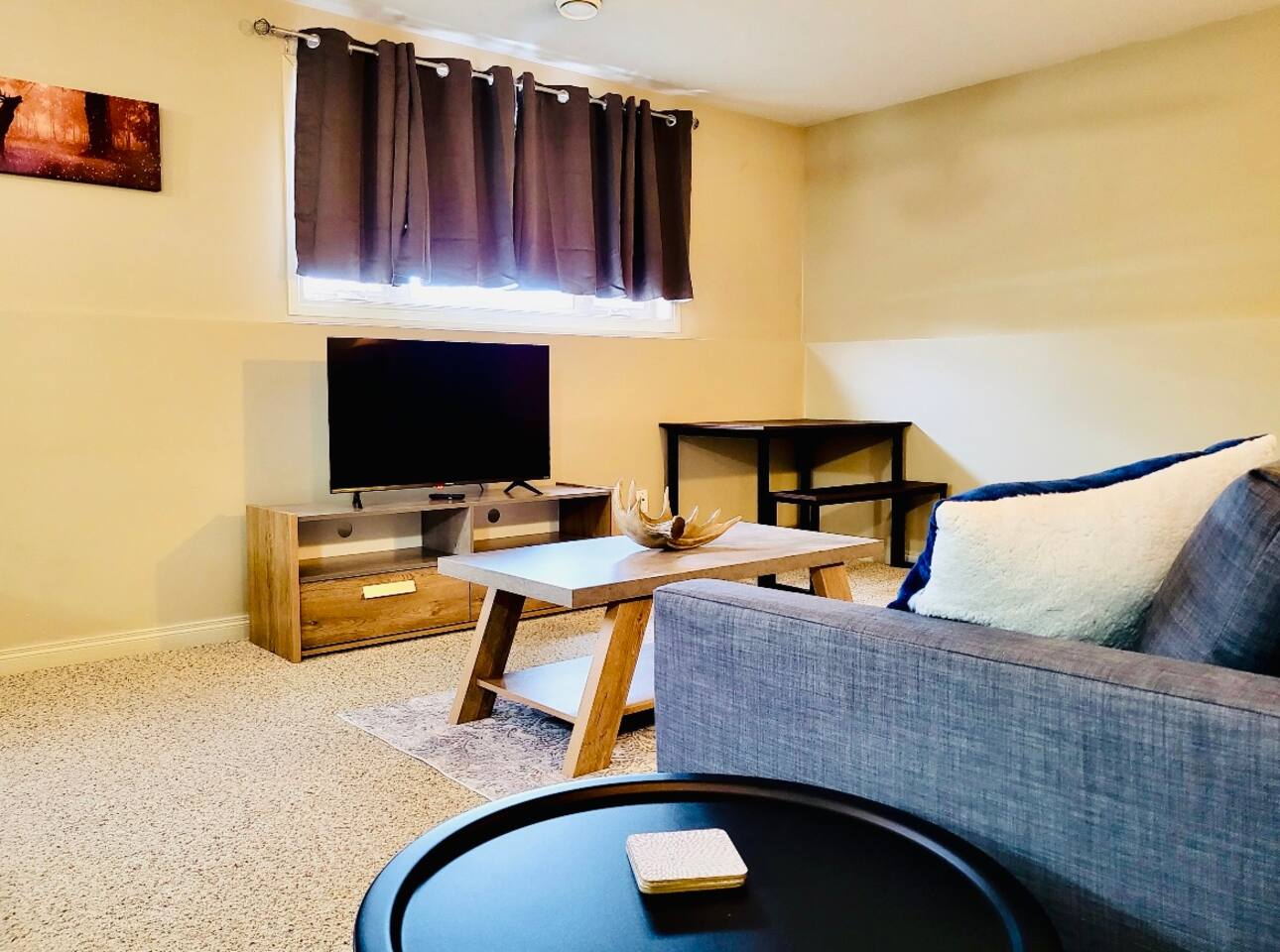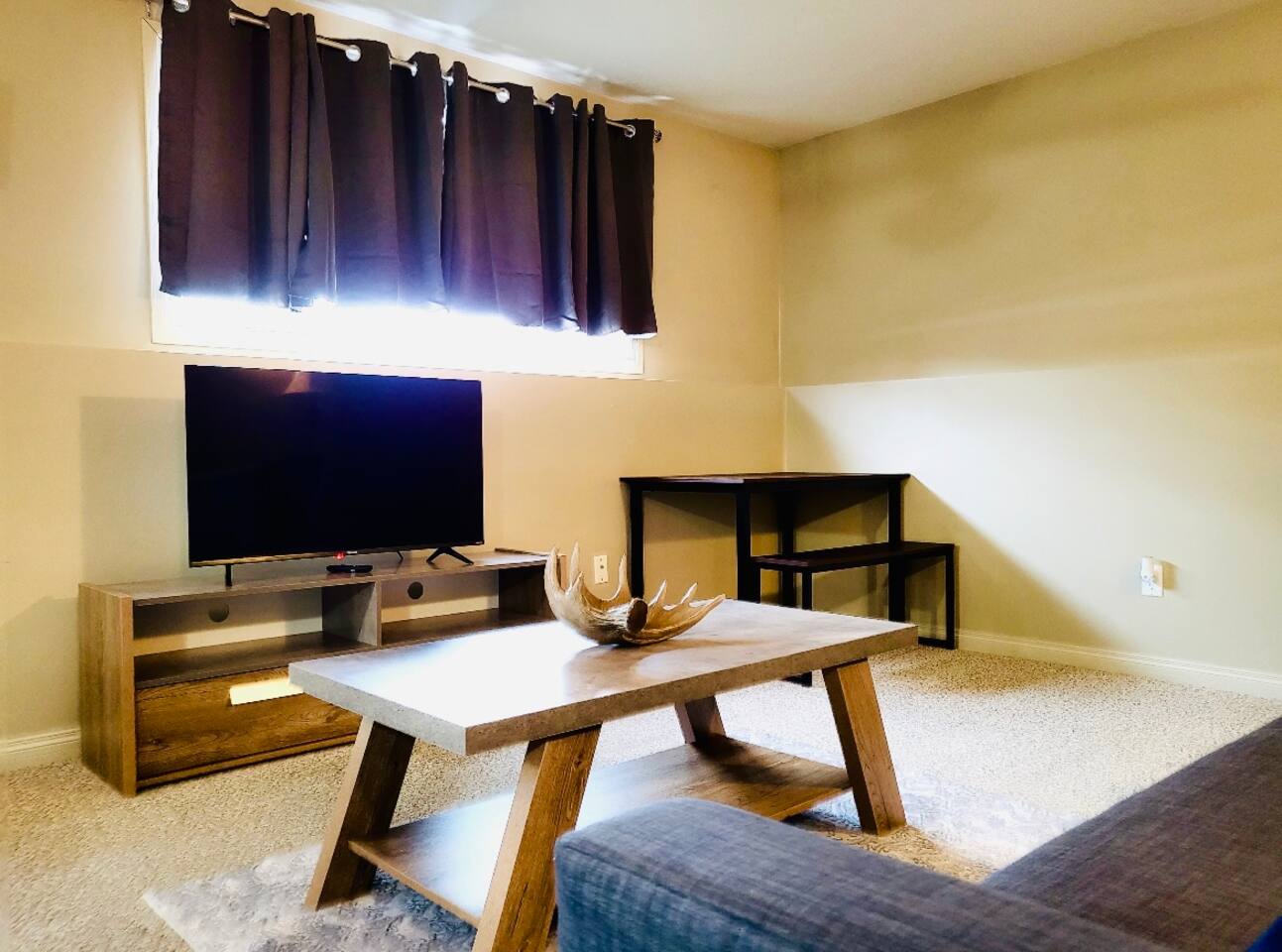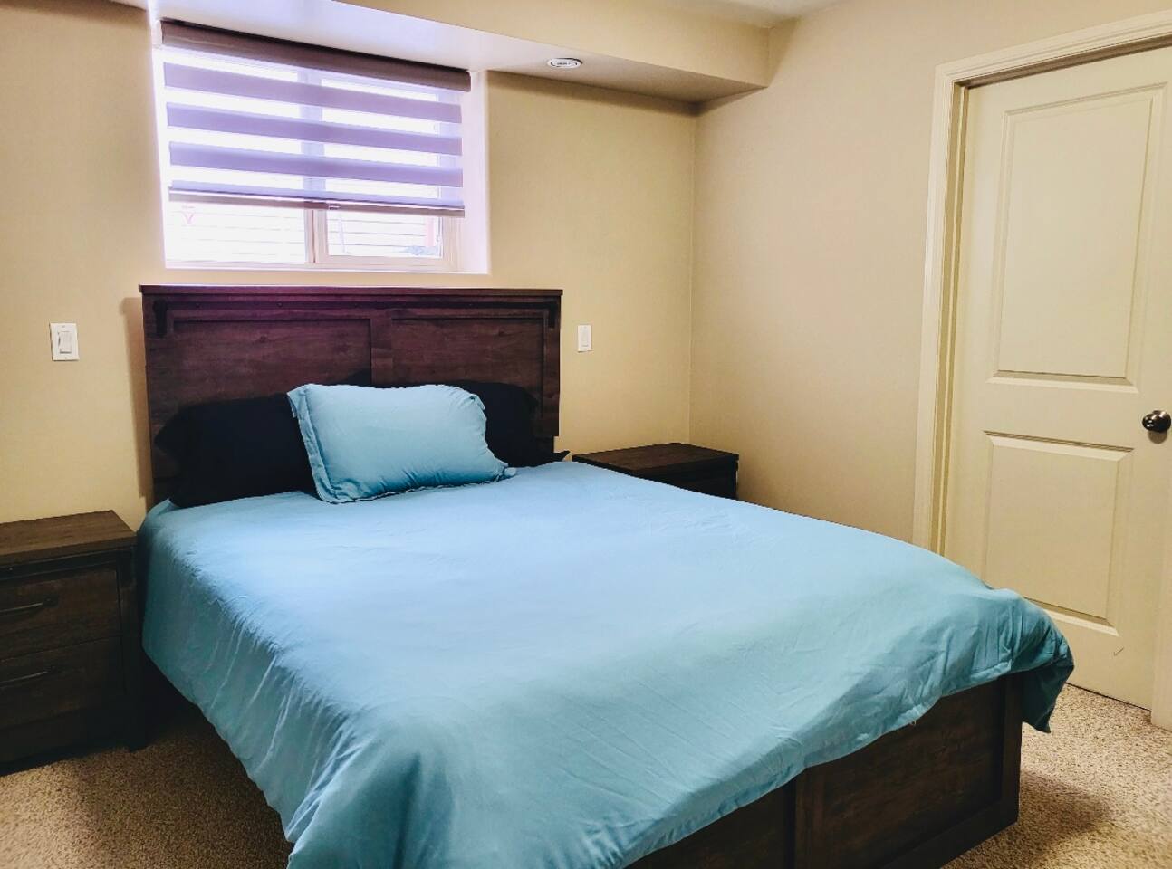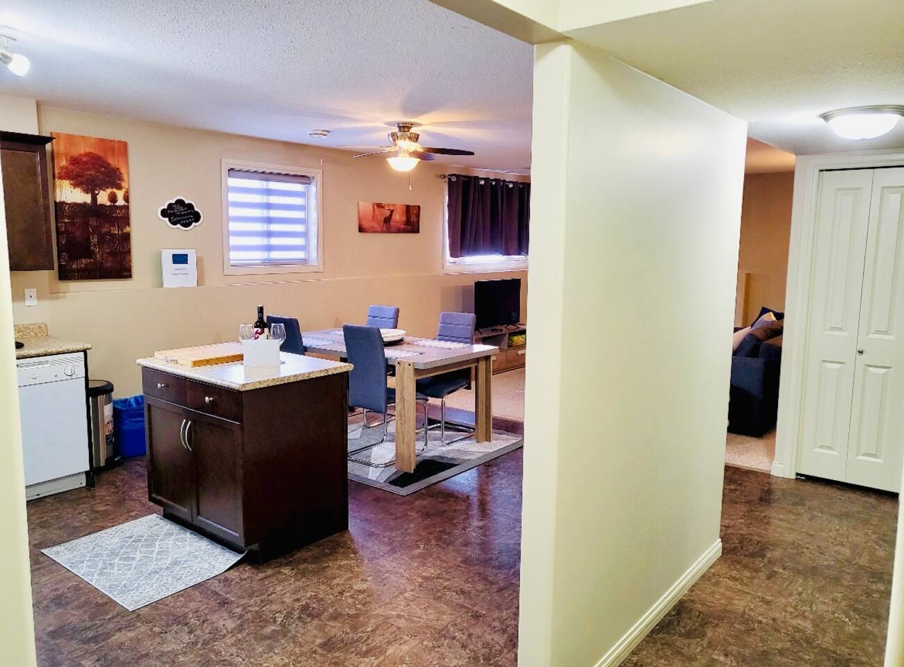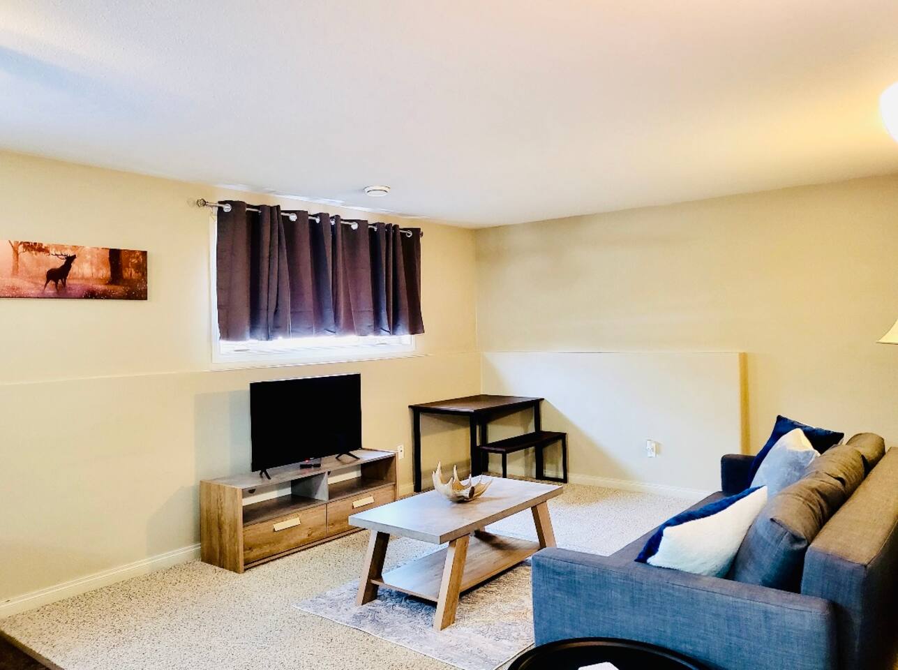 Spacious basement suite in Victoria Park, Camrose, featuring two queen beds and a pullout couch for flexible sleeping arrangements. Enjoy plenty of natural light during the day, a fully stocked kitchen, and a full bathroom. Stay entertained with board games or relax with Disney+. The large deck comes with a BBQ and outdoor seating, perfect for outdoor enjoyment. The suite stays cool in the summer, and free laundry machines are available for your convenience.