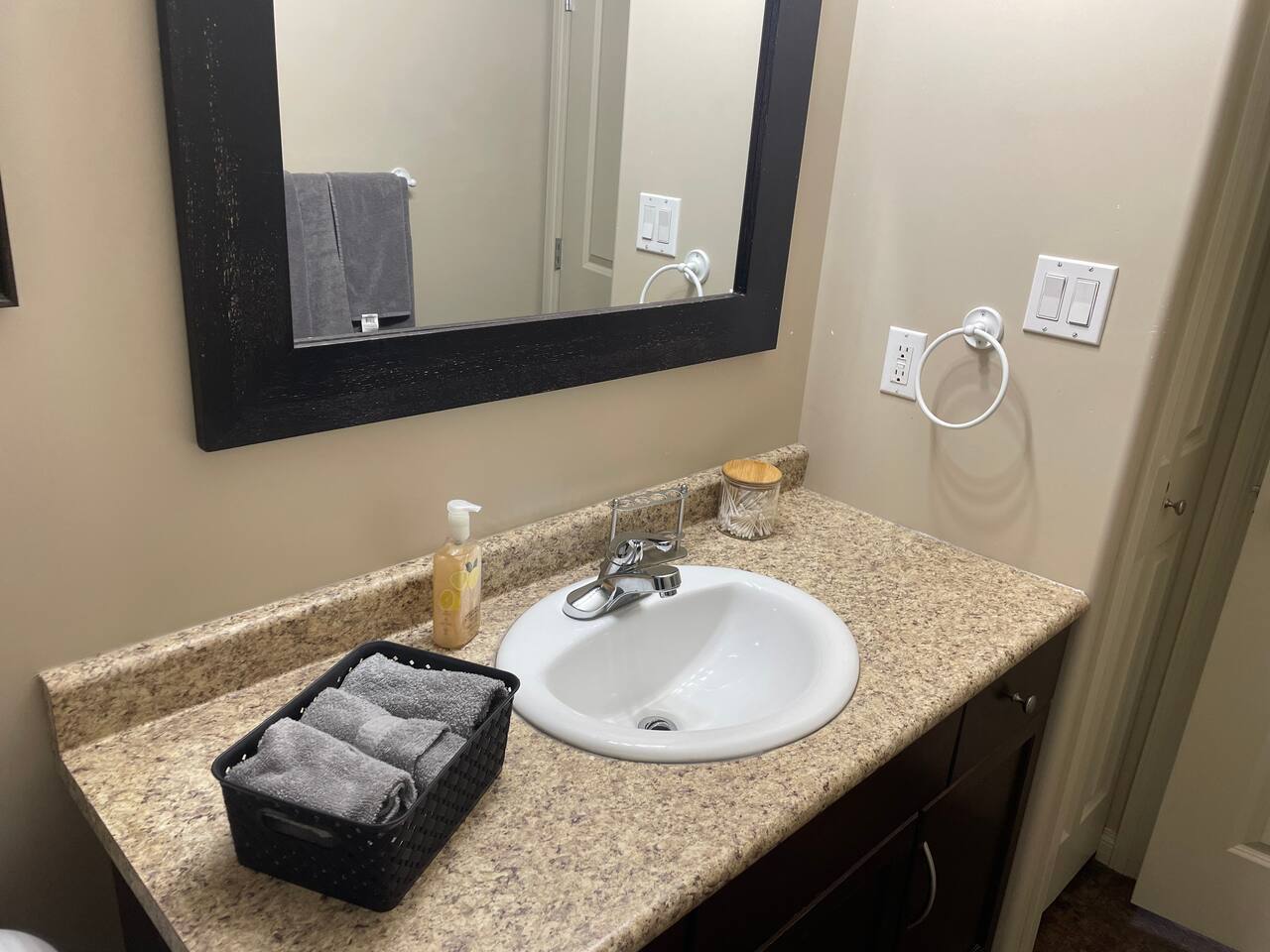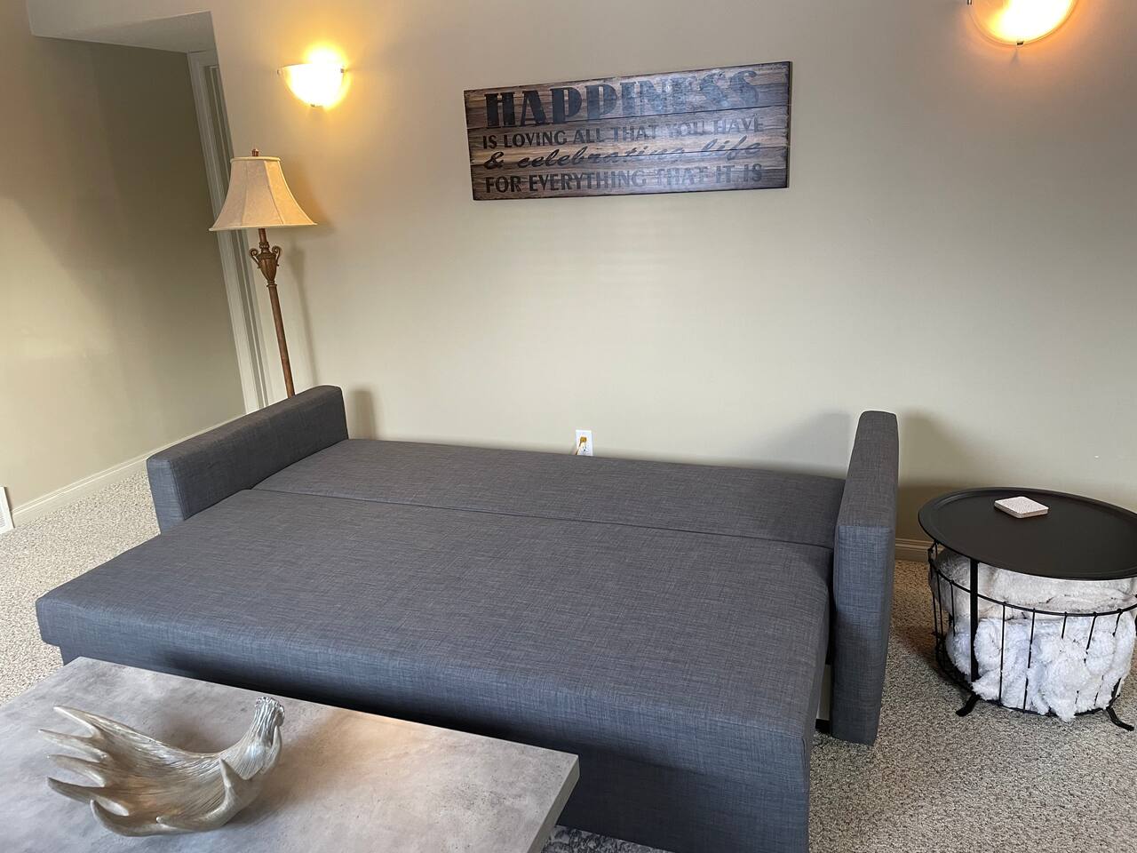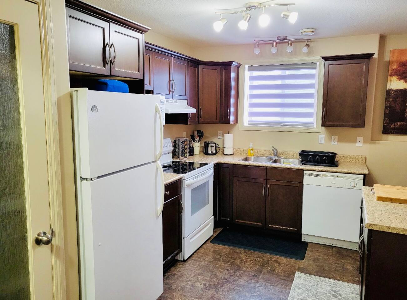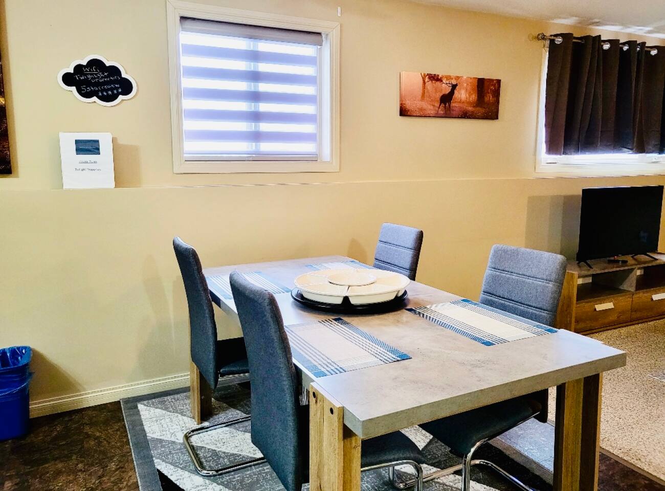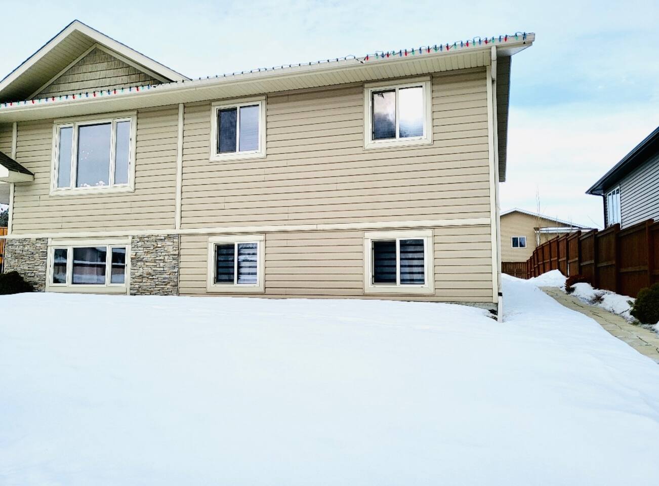 Spacious basement suite in Victoria Park, Camrose, featuring two queen beds and a pullout couch for flexible sleeping arrangements. Enjoy plenty of natural light during the day, a fully stocked kitchen, and a full bathroom. Stay entertained with board games or relax with Disney+. The large deck comes with a BBQ and outdoor seating, perfect for outdoor enjoyment. The suite stays cool in the summer, and free laundry machines are available for your convenience.