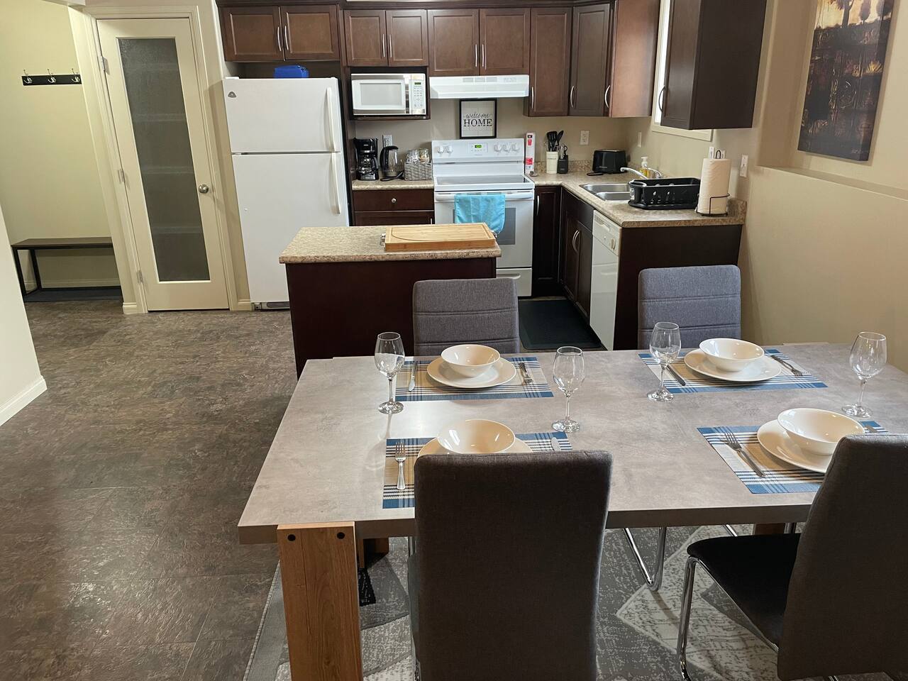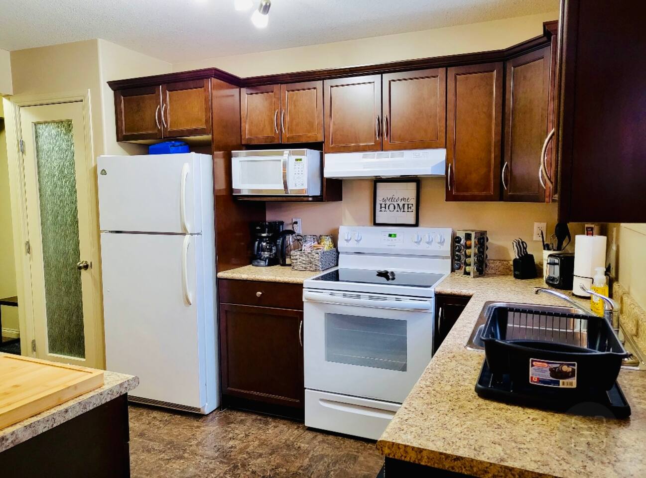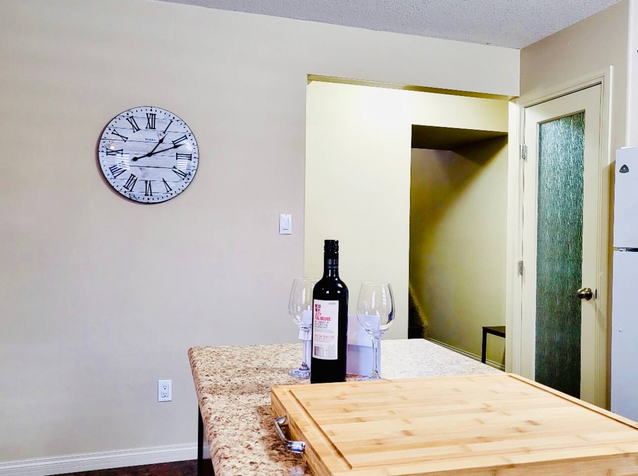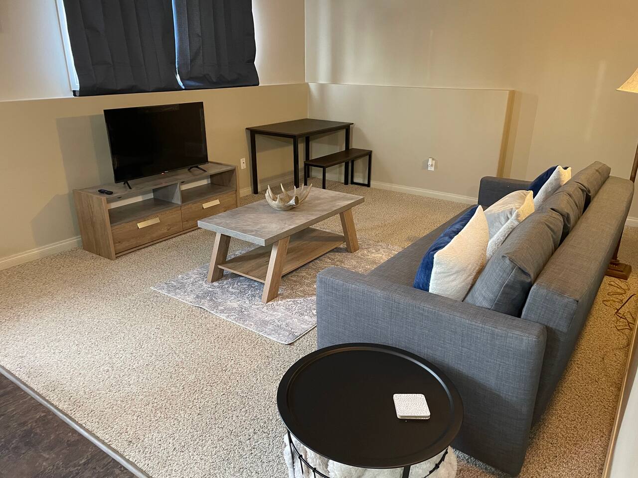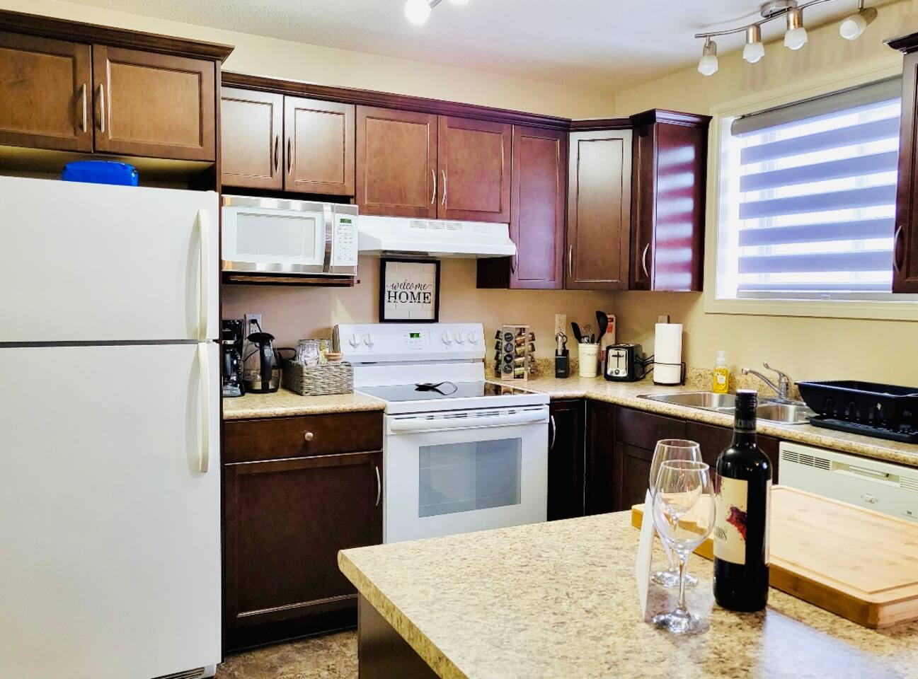Spacious basement suite in Victoria Park, Camrose, featuring two queen beds and a pullout couch for flexible sleeping arrangements. Enjoy plenty of natural light during the day, a fully stocked kitchen, and a full bathroom. Stay entertained with board games or relax with Disney+. The large deck comes with a BBQ and outdoor seating, perfect for outdoor enjoyment. The suite stays cool in the summer, and free laundry machines are available for your convenience.