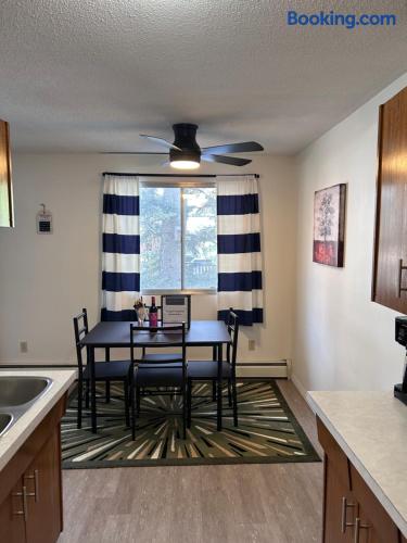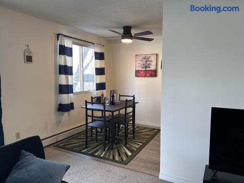 This charming one bedroom, one bathroom apartment offers a comfortable living space featuring a queen size bed, a futon in the living area, and a fully equipped kitchen. For entertainment, guests can enjoy Disney+ and board games. The apartment is equipped with a portable A/C unit for added comfort, and the private balcony with outdoor furniture offers a tranquil retreat and scenic views. Conveniently located near the University of Alberta Augustana Campus, St. Mary’s Hospital, Mirror Lake, walking trails, the Arts Center, downtown, and shopping areas. Additional amenities include coin laundry and a vending machine on the ground floor. Private parking is available on the west side of the property, with additional street parking surrounding the building.