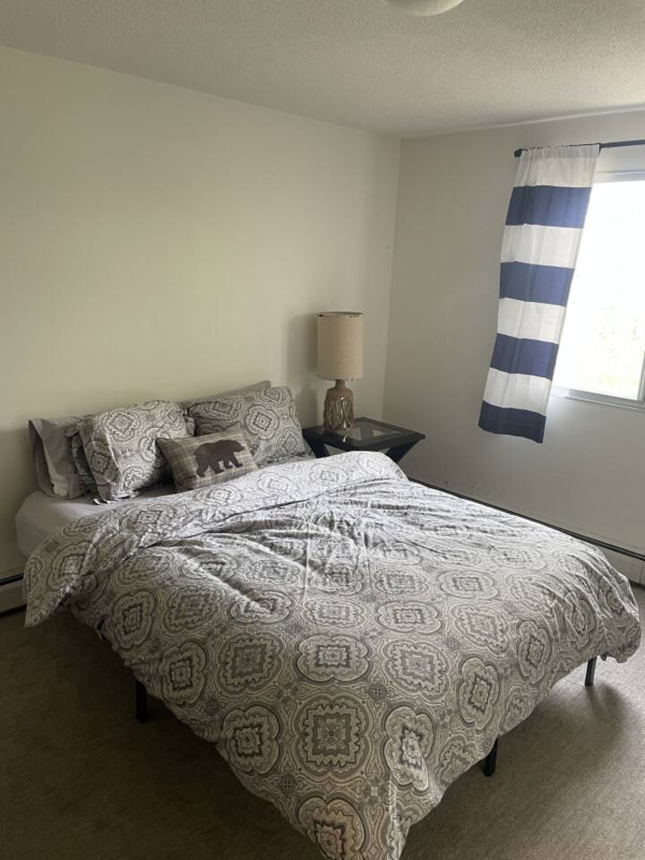 This charming one bedroom, one bathroom apartment offers a comfortable living space featuring a queen size bed, a futon in the living area, and a fully equipped kitchen. For entertainment, guests can enjoy Disney+ and board games. The apartment is equipped with a portable A/C unit for added comfort, and the private balcony with outdoor furniture offers a tranquil retreat and scenic views. Conveniently located near the University of Alberta Augustana Campus, St. Mary’s Hospital, Mirror Lake, walking trails, the Arts Center, downtown, and shopping areas. Additional amenities include coin laundry and a vending machine on the ground floor. Private parking is available on the west side of the property, with additional street parking surrounding the building.